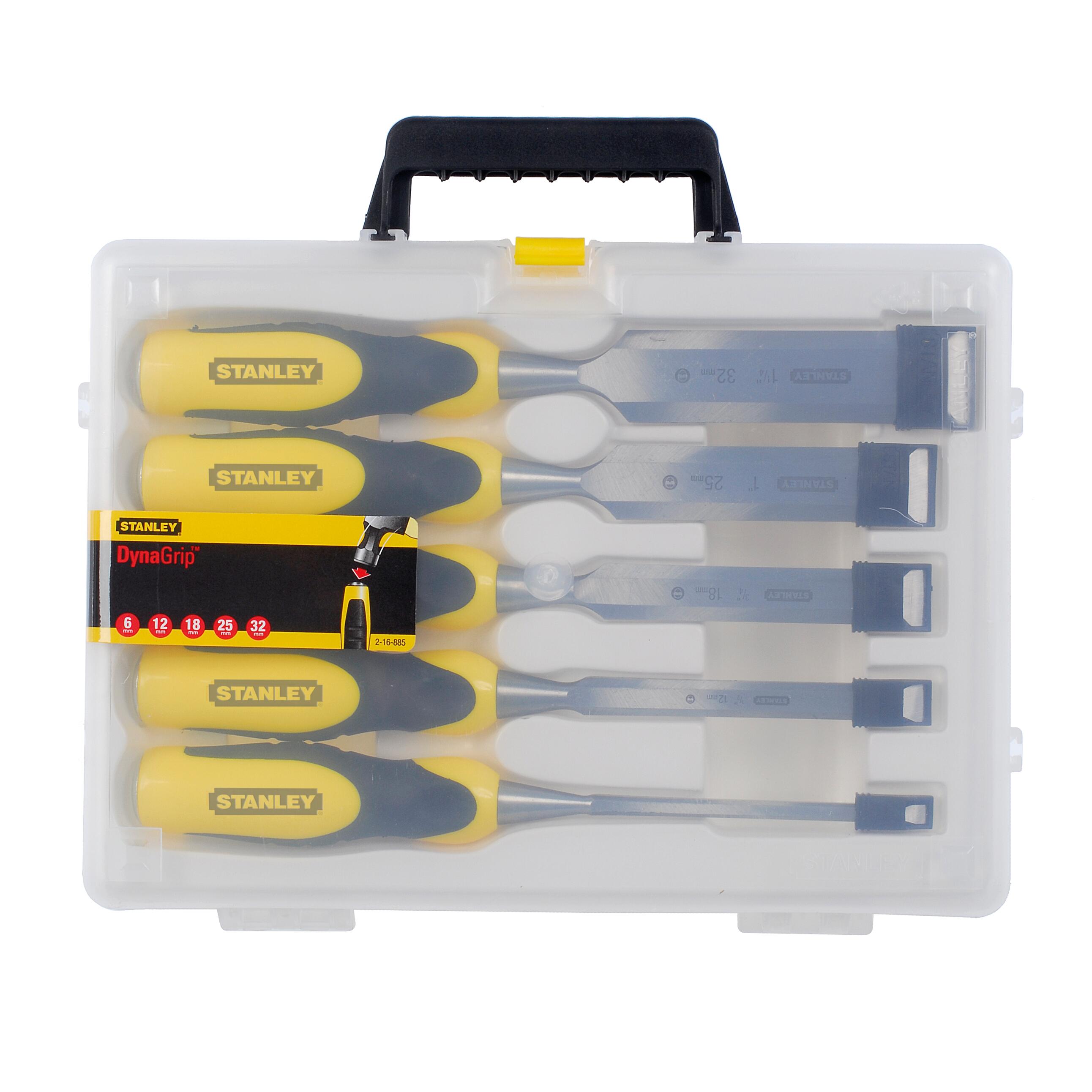 Set di 5 scalpelli per legno Dynagrip. Lama in acciaio forgiato e temprato, superfici retificate, lama completamente riaffilabile. Estremità dell'impugnatura in acciaio per lavorare anche con un martello ed aumentare la forza applicata. Impugnatura bi-material in materiale sintetico rigido e polipropilene morbido