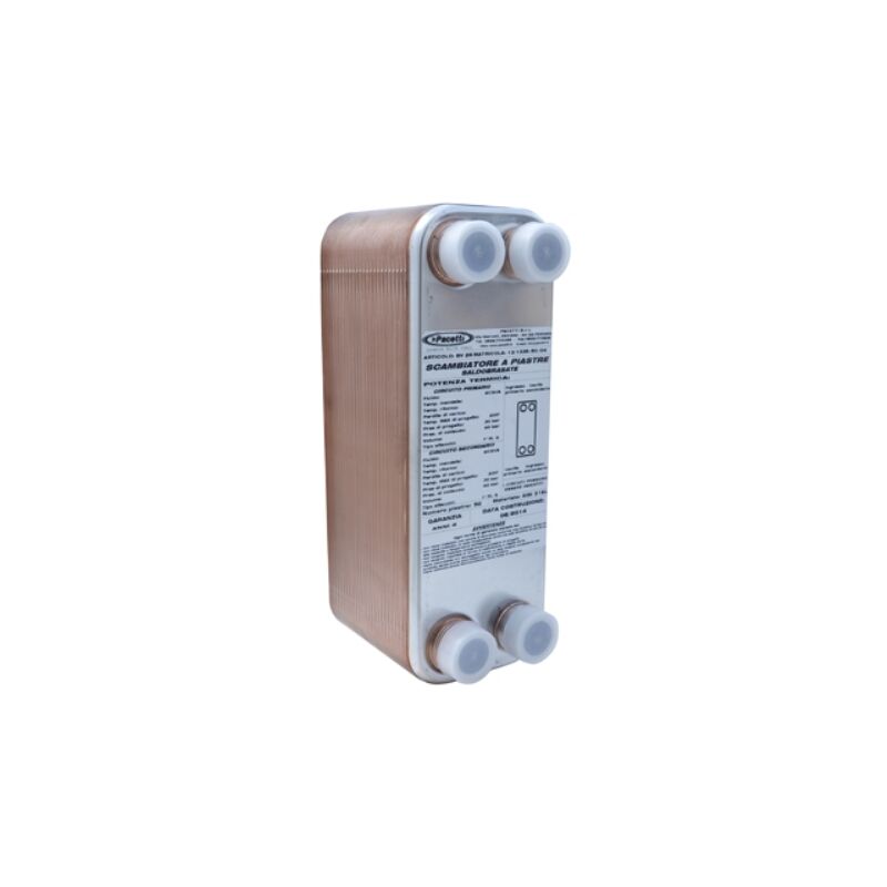 Piastre corrugate in acciaio inox 316L saldate insieme per brasatura a rame in forni sottovuoto. Bocchelli di ingresso e uscita realizzati in acciaio inox 316L forniti filettati di serie.