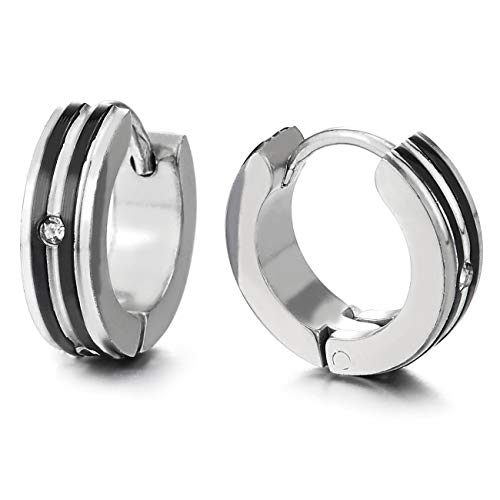 2 Scanalato Orecchini a Cerchio con Smalto Nero e Zirconi, Uomo Donna, Acciaio Inossidabile