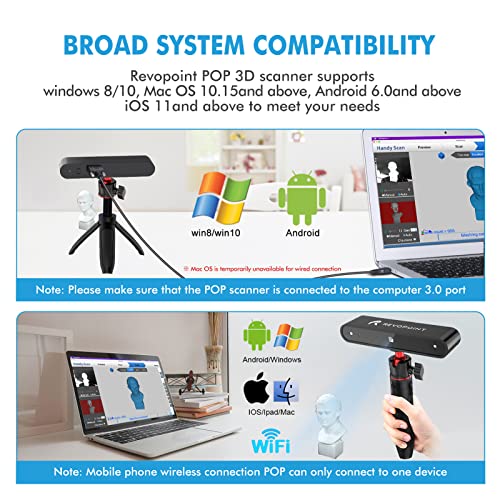 【Ampia compatibilità di sistema】 Lo scanner POP 3D supporta la connessione cablata e la connessione WIFI wireless, ampia compatibilità, supporta i sistemi operativi Windows 8/10, ios 11, Android 6.0, Mac OS 10.15 e versioni successive. (Assicurati che lo scanner POP sia collegato alla porta 3.0 del computer)