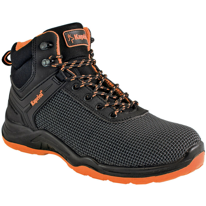 Scarpa no-safety kapriol DART 02 arancio modello alto CARATTERISTICHE TECNICHE: Linguetta e bordo imbottiti Rinforzo sul tallone per migliore stabilità Suola con speciali scolpiture antiscivolo e autopulenti in PU-PU Tomaia in robusto tessuto sintetico + Air Mesh EN ISO 20345:2011