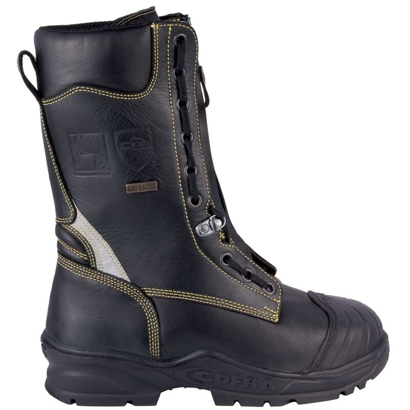 Stivaletto Cofra per VIGILI DEL FUOCO - Serie SPECIALS / WATERPROOF, modello NO FLAMEDalla linea Cofra SPECIALS uno stivaletto robusto e confortevole, specifico per vigili del fuoco e certificato F2A, dotato di tomaia in pelle fiore ignifuga e idrorepellente oltre ceh antitaglio. La fodera COFRA-TEX WATERPROOF è una membrana semi-permeabile che avvolge interamente il la calzarura, lasciando uscire il vapore per mantenere il piede asciutto senza far entrare acqua.La sua comoda soletta HEAT BARRIER ha un design anatomico, stampata in una speciale mescola antistatica di poliuretano profumato ed è stata messa a punto per garantire l'isolamento dalle alte temperature.La suola interamente in gomma nitrilica è resistente a temperature estreme da -20 a +300° C neutralizza impatti fino a 30J e grazie all'ampia zona d'appoggio e al design a ramponi, garantisce massima stabilità su ogni tipo di terreno.La sicurezza del piede è garantita dalla morbida lamina antiperforazione in tessuto APT Plate