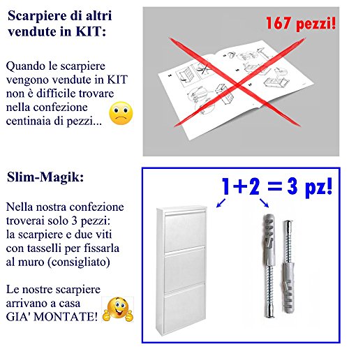 NON DEVI MONTARE NIENTE: Arrivano GIA' MONTATE (non è un KIT) con in dotazione viti e tasselli per poterle fissare al muro. La scarpiera Slim Originale può essere collocata e fissata al muro anche sopra lo zoccolino, oppure, se si ha più di una scarpiera, si potranno fissare una sopra l'altra.