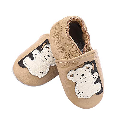 Scarpine primi passi in morbida pelle con suola in camoscio, orso oro, 0-6 mesi