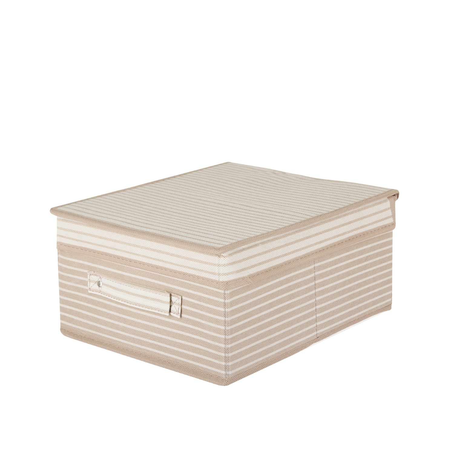Le scatole armadio Sofia sono accessori pratici e indispensabili per gestire il cambio dell'armadio ogni anno. Questo modello è completo di coperchio per preservare il contenuto da polvere e umidità: puoi riporre e organizzare all'interno sciarpe, cinture, magliette e altri accessori che ti serve archiviare nei ripiani alti del guardaroba con l'arrivo della nuova stagione. Facile da montare, è dotata di pratica maniglia in tessuto per estrarla facilmente. Resistente e robusta quando la utilizzi, all'occorrenza si può piegare e appiattire per occupare il minimo ingombro. Il piacevole design in tessuto con stampa a righe beige la rende una perfetta scatola anche da lasciare in bella vista. Dimensioni: 28x33x15 cm.