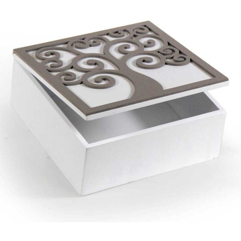 CARATTERISTICHE SCATOLA COFANETTO PORTA OGGETTI 17X17X8 La Scatola cofanetto porta oggetti e'un contenitore in legno decorativo per cameretta ragazzi e bambini, camera da letto e salotto, e' un contenitore multiuso utilizzabile anche in ambienti ad alta umidità come bagno o cucina. Potrete utilizzare questo contenitore portaoggetti in maniera universale, ideale se desiderate conservare minuterie come gioielli o pupazzetti, accessori da bagno, cosmetici o altri piccoli oggetti. Il coperchio e' totalmente rimovibile, resta stabile non scivola con decorazione albero della vita. Componente d'arredo che non può assolutamente mancare su uno stile di casa moderna ma tuttavia può essere inserito anche in altri stili d'arredamento. Con coperchio: coperchio rimovibile con decorazione albero della vita, il coperchio resta stabile e non scivola, e' un componente d'arredo che non può assolutamente mancare su uno stile di casa moderna ma tuttavia può essere inserito anche in altri stili