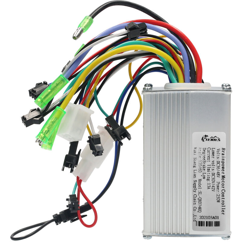 Il motore di azionamento del controller senza spazzole si avvia in modo piu fluido e rende la guida piu confortevole. Caratteristiche: Il controller del motore brushless puo fornire una velocita costante e un controllo sensibile della frenata e dei cambi di direzione. Il guscio del controller in lega di alluminio puo proteggere il circuito interno grazie alla buona funzione di dissipazione del calore per evitare il sovraccarico termico. I cavi e le interfacce garantiscono un basso malfunzionamento per un uso prolungato. Il controller elettrico senza spazzole e adatto per la maggior parte delle biciclette elettriche e degli scooter elettrici. Specificazione: Potenza: 250 W / 350 W (opzionale) Voltaggio: 36-48V Corrente: 13A Voltaggio inferiore: DC 30V / 42V Angolo frase motore adatto: 120 ° / 60 ° Materiale: lega di alluminio Dimensioni: 90 * 52 * 30 mm / 3,5 * 2,0 * 1,2 pollici Peso del pacchetto: ca. 196 g / 6,9 once Elenco dei pacchetti: 1 * Controller senza spazzole