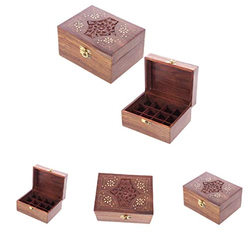Scatola in Legno Sheesham per Oli Essenziali Intarsiata con Fiori per 12 bottigliette