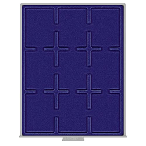 Scatola per monete Marine con 9 incavature á 64 × 86 mm [Lindner 2219M], Con cassetto grigio, cornice cristallino e inserto in velluto blu