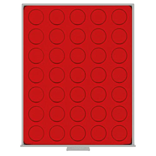 Scatola per monete Standard con 35 incavature á 32,5 mm Ø per monete sciolte (Lindner 2111) con cassetto grigio, cornice cristallino & inserto in velluto rosso chiaro