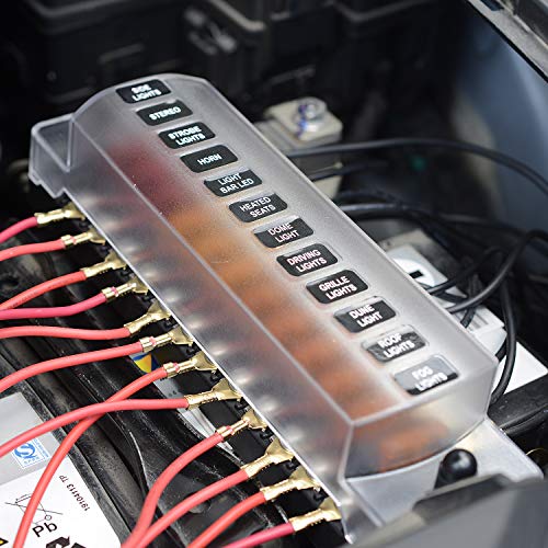 Blocco fusibili ATO/ATC per auto a 12 circuiti con coperchio di protezione a prova di umidità trasparente.