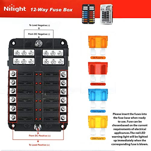 [Unità fusibili compatta]: la scatola dei fusibili lamellari a 12 vie è compatta con luci di funzionamento a led e fusibili di diversa portata. La scatola dei fusibili del circuito ha un lato positivo e negativo, installa e fornisce circuiti a tensione diversa. La copertura trasparente del PC, la struttura resistente agli schizzi e alla polvere possono aggiungere una protezione extra per la scatola dei fusibili