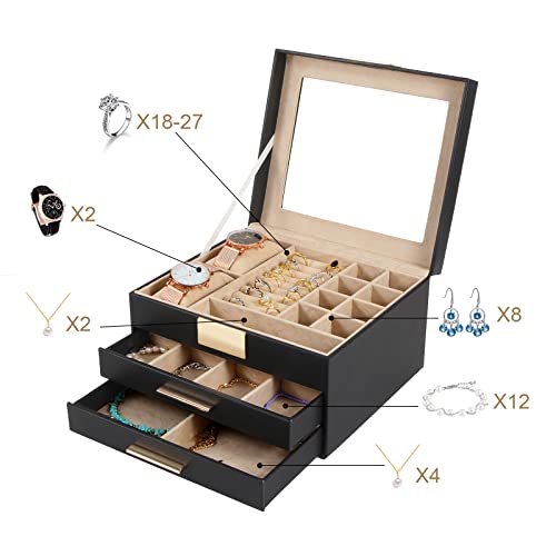 Scatola Portagioie con Coperchio Trasparente, Portagioie a 3 Livelli, 2 Cassetti, Portagioie Donna, Espositore per Orologio, Porta Gioielli, Cofanetto Portagioie, festa della mamma idee regalo,(Nero)