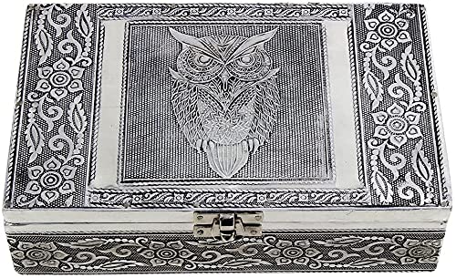 Scatola portagioie in stile antico, intagliata a mano in legno con finitura in metallo goffrato con gufo