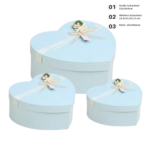 1) Set da 3 pezzi versatili: contiene tre scatole regalo a forma di cuore blu con nastro, ognuna in diverse dimensioni.