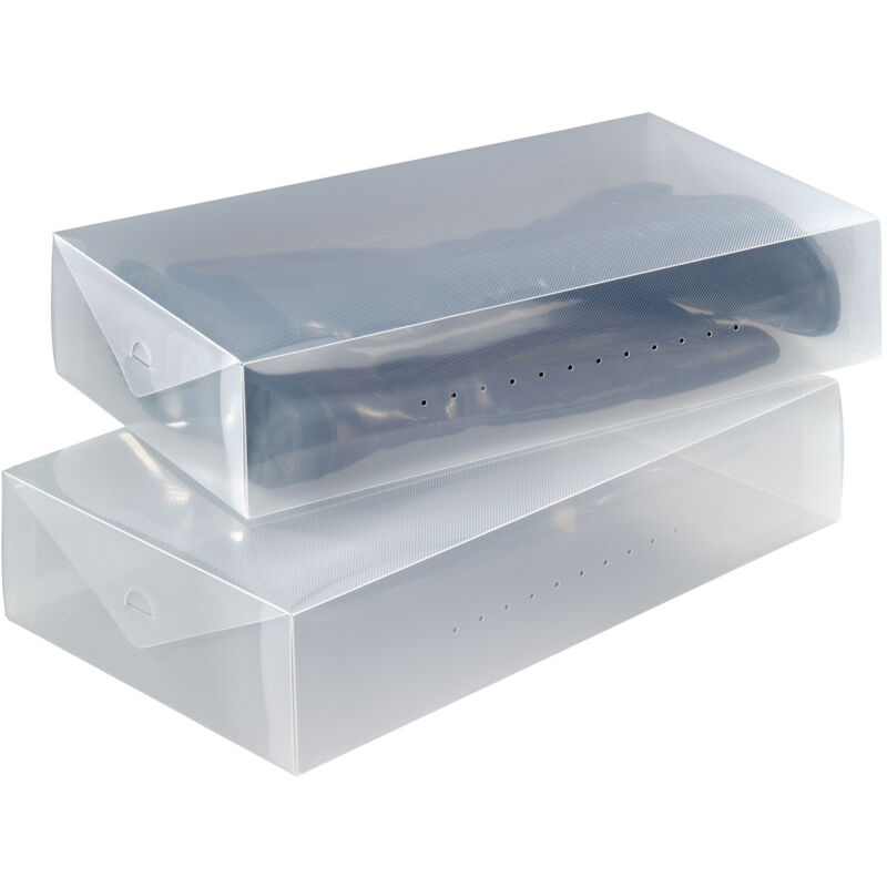 Il pratico set di 2 scatole porta-stivali tiene al sicuro dalla polvere e a portata di mano tutti i tuoi stivali. Le scatole sono maneggevoli e impilabili, permettendo di mantenere l'ordine in ogni armadio o scaffale. Grazie alla loro trasparenza, le scatole consentono di vedere rapidamente il contenuto, evitando fastidiose ricerche. Con questo set di 2 scatole porta-stivali, non dovrai più preoccuparti di tenere le tue scarpe in ordine. Le dimensioni di ogni scatola sono di 52 x 11 x 30 cm.