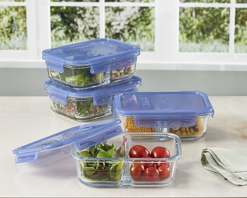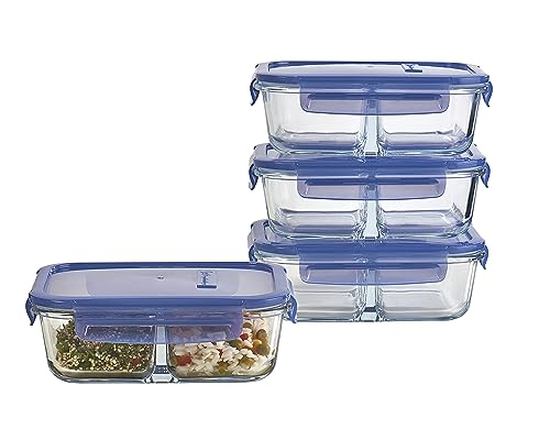 Scatola di Stoccaggio con Scomparti (L) - 1030 cc, Set di 4, Contenitori Grandi per Alimenti in Vetro con Scomparti e Coperchi, Pianificazione dei Pasti, Adatti al Microonde, Ermetico