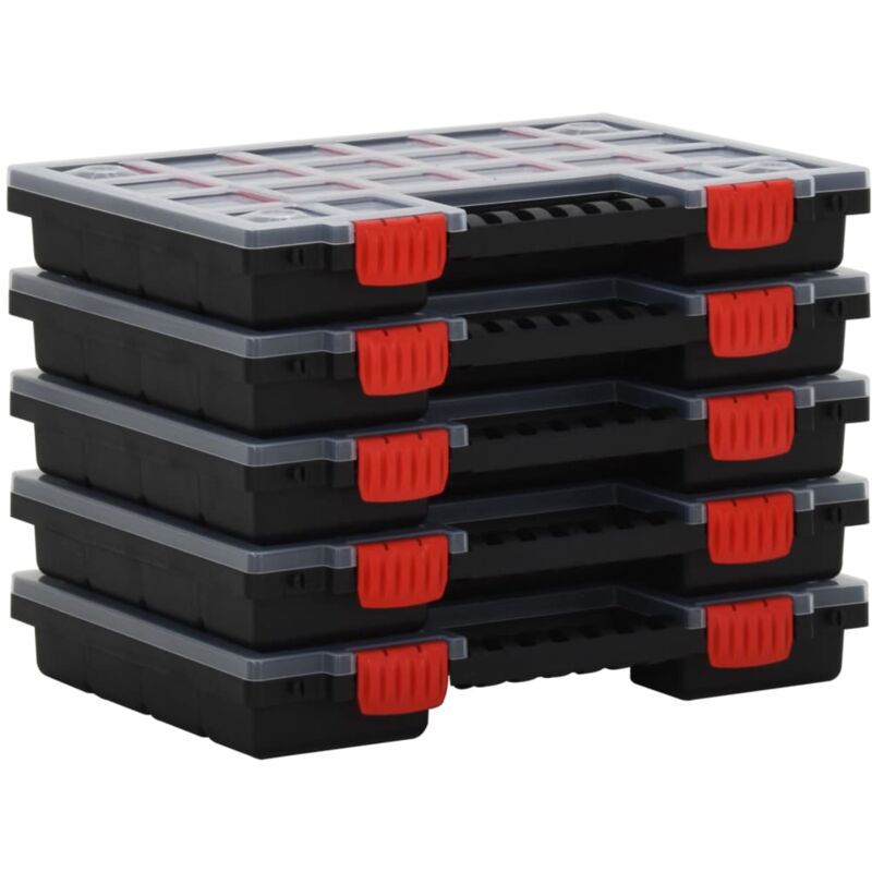 Questo comodo set di cassette, dotate di divisori regolabili, è un pratico aiuto in garage, in laboratorio e in luoghi simili! Coperchio trasparente: Il coperchio trasparente consente di vedere il contenuto interno. Quindi, potrete riconoscere e trovare facilmente bulloni, dadi, chiodi e altri piccoli oggetti. Divisori regolabili: La cassetta portaoggetti, dotata di divisori regolabili, può essere suddivisa in più scomparti, assicurando che tutti gli utensili trovino il loro posto. Ampio utilizzo: Questo pratico strumento organizzativo è sicuramente un'ottima scelta per le persone che apprezzano l'ordine e la pulizia durante i lavori fai-da-te e artigianali, ma anche per i professionisti sul posto di lavoro. Colore: Trasparente, nero e rosso Materiale: PP (polipropilene) Dimensioni: 34,5 x 25 x 5 cm (L x P x A) 15 Divisori per ogni cassetta Ad incastro Con un manico La consegna include: 5 Cassette a scomparti