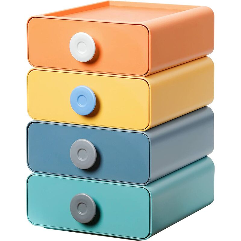 Un sacco di spazio di archiviazione - Un set di quattro contenitori con cassetti, contenitori a strati, posizionamento ordinato, facile distinguere i diversi articoli Il contenitore è realizzato in materiale PP, che è sporco -resistente e non ha odore particolare, è sicuro ed ecologico ed è facile da pulire. Angoli arrotondati e lisci, non graffiano le mani Quattro scatole possono essere impilate liberamente senza installazione, quattro colori, qualsiasi combinazione, la parte inferiore e superiore della scatola formano una scanalatura, l'impilamento è stabile, inclinabile non cade 【Design unico】 Design del cassetto, con maniglie rotonde, lisce e comode da tirare. La scanalatura superiore può essere utilizzata anche per posizionare oggetti, risparmiando così spazio sulla scrivania Ha una vasta gamma di usi, non solo per riporre articoli di cancelleria, ma anche per riporre tutti i tipi di cosmetici, prodotti per la cura della pelle, forniture per ufficio e accessori per capelli, ecc.