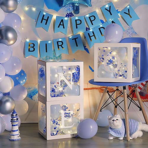 Scatole Palloncini Primo Compleanno, Blocchi di Palloncini Bianchi Trasparenti One con Luci Stringa LED Lucciola, Palloncini Macaron Arcobaleno per Bambini Compleanno Foto Prop (Blu)