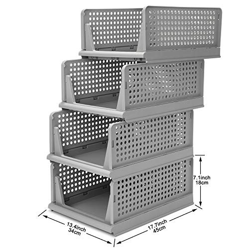 Set di 4 scatole pieghevoli per guardaroba, in plastica, per scaffali, cestini, cassetti impilabili ed estraibili, colore grigio