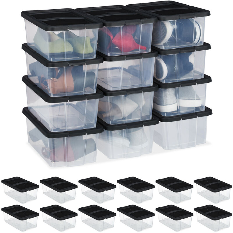 Grazie a queste scatole impilabili, avete la possibilità di avere le vostre scarpe preferite, come ad esempio sneaker, ballerine, sandali ecc., sempre in ordine e a portata di mano, senza ingombrare tanto spazio. Nei 24 contenitori trasparenti le calzature sono facilmente riconoscibili, in modo da avere sempre la calzatura adatta per il vostro outfit. Impilate le scatole con il coperchio una sopra l'altra oppure posizionatele sotto il bagno o all'interno dell'armadio. I contenitori possono essere utilizzati anche per sistemare in ordine le costruzioni o i giocattoli. Set da 24 scatole di plastica per le scarpe in dettaglio - Misure esterne HxLxP: 12,5 x 20 x 34,5 cm ca. - Dimensioni interne HxLxP: 11,5 x 17,5 x 32 cm ca. - Misure della base delle scatole LxP: 16 x 29,5 cm ca. - Peso per box: 240 g ca. - Materiale: PP - Colore: trasparente, nero - In un pratico set da 24 Scatole trasparenti con coperchio - Per sneaker, stivaletti, sandali, ballerine ecc. - Box trasparenti - Scarpe