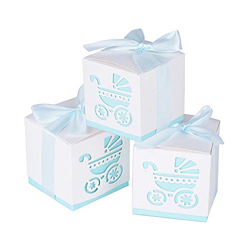 50 PZ Scatoline Portaconfetti Battesimo Azzurro per Ragazzo, Scatoline Nascita con Impronta Carina e Nastri Eleganti, 6X6X6cm Scatole Bomboniere per Battesimo, Nascita, Baby Shower