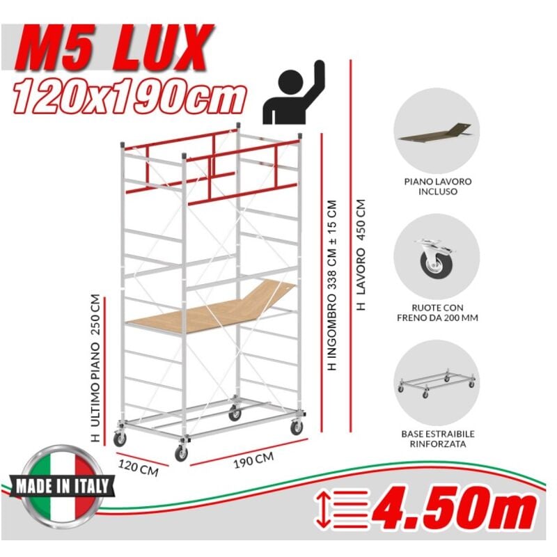 L' acquisto comprende 1 base estraibile rinforzata 190x120 cm (ingombro) 1 campata h 150 cm (2 spalle + 2 correnti + 4 diagonali) 1 parapetto terminale h 150 cm (2 spalle + 4 DIAGONALI + 2 terminali) COLORE ROSSO INDICATIVO 1 piano in betulla fisso con telaio in acciaio zincato (190x45 cm) 1 piano in betulla con botola e telaio in acciaio zincato (190x45 cm) 4 ruote girevoli in gomma nera corredate di freno da 200 mm Il trabattello M5 LUX è adatto per usi professionali, edilizia, manutenzioni civili ed industriali, settore elettrico. Facile da montare e smontare, è dotato di una base estraibile rinforzata in quattro pezzi ed è corredato di ruote da diametro 200 mm. Il piano di lavoro in legno è raggiungibile dall'interno attraverso una botola di passaggio. I piani di lavoro sono collegabili ogni 30 cm. I tiranti diagonali sono facilmente applicabili su appositi bussolotti alettati senza alcun uso di viti e bulloni. Il trabattello è zincato elettroliticamente e completo di certificato