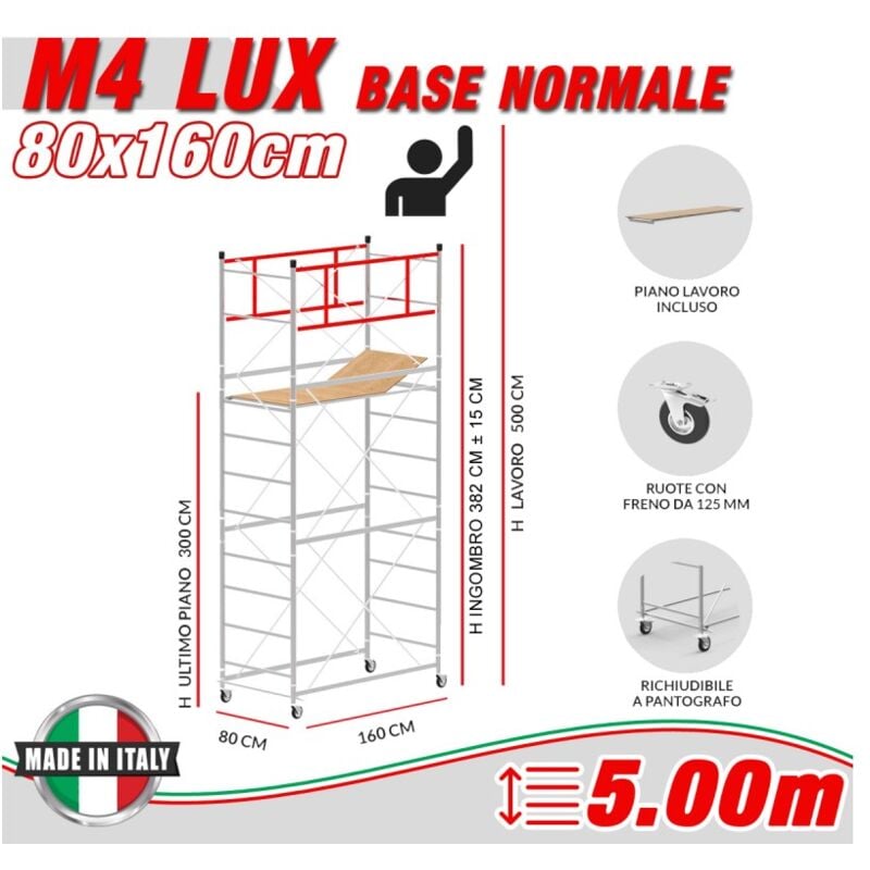 L' acquisto comprende 1 base normale 160x80 cm (ingombro) 2 campate h 120 cm (4 spalle + 4 correnti + 8 diagonali) 1 parapetto terminale h 120 cm (2 spalle + 4 DIAGONALI + 2 terminali) COLORE ROSSO INDICATIVO 1 piano in betulla con botola e telaio in acciaio zincato (160x64 cm) 4 ruote girevoli in gomma nera corredate di freno da 125 mm Il trabattello M4 LUX con base normale è adatto per usi professionali, edilizia, manutenzioni civili ed industriali, settore elettrico. Facile da montare e smontare, è corredato di ruote da diametro 125 mm. Il piano di lavoro in legno è raggiungibile dall'interno attraverso una botola di passaggio. I piani di lavoro sono collegabili ogni 30 cm. I tiranti diagonali sono facilmente applicabili su appositi bussolotti alettati senza alcun uso di viti e bulloni. Il trabattello è zincato elettroliticamente e completo di certificato di conformità. Clicca qui e scopri cos'è la zincatura elettrolitica, come funziona e come protegge i trabattelli in acciaio