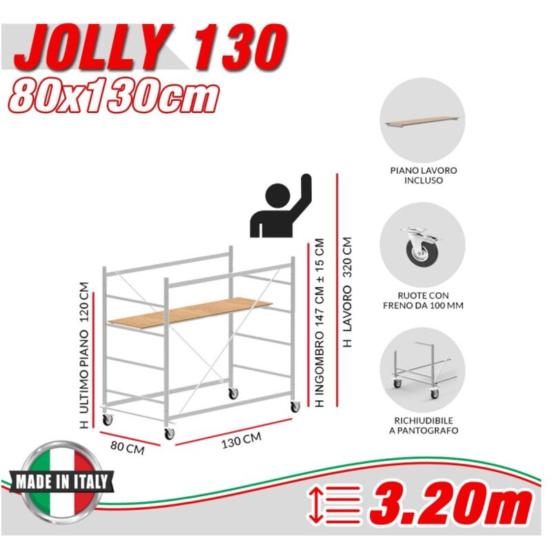 L' acquisto comprende 1 base 130x80 cm (ingombro) 1 campata h 120 cm (2 spalle + 2 correnti + 2 diagonali) 1 semipiano in betulla (130x30 cm) 4 ruote girevoli in gomma nera corredate di freno da 100 mm Per l'utilizzo semiprofessionale e per il fai da te. Trabattello in acciaio zincato elettrolitico. Facilissimo da montare e smontare. Smontando l'asta laterale può passare attraverso porte e corridoi. Maneggevole grazie alle sue campate da 120 cm. Poco ingombrante, leggero e sicuro. Corredato di 4 ruote diametro 100 mm. I piani di lavoro sono collocabili ogni 30 cm. I tiranti diagonali sono facilmente applicabili su appositi bussolotti alettati senza alcun uso di viti e bulloni. Clicca qui e scopri cos'è la zincatura elettrolitica, come funziona e come protegge i trabattelli in acciaio Principali altezze Altezza ingombro Ultimo piano Lavoro con operatore 1,50 m 1,20 m 3,20 m Sfilando l'apposita asta alla base, è possibile richiudere il trabattello perché occupi il minimo spazio e per
