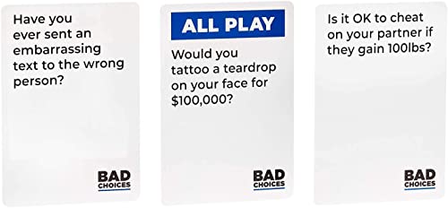 CHIAMARE I TUOI AMICI È DIVERTENTE E PUOI GIOCARE A BAD CHOICES 1000 DI VOLTE: Il gameplay cambia ogni volta in base a chi stai giocando. Età: 15+, Tempo: 20-45 Minuti, Giocatori: 3+