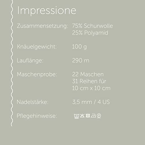 Impressione è una miscela colorata di 75% di lana vergine superwash finita e 25% di poliammide.