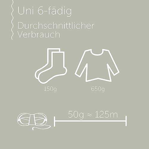 Il filato per calze in gomitolo di facile manutenzione e con una lunghezza di ca. 125m/50g è adatto per il lavoro a maglia e all'uncinetto e per un ago di 3-4 mm;
