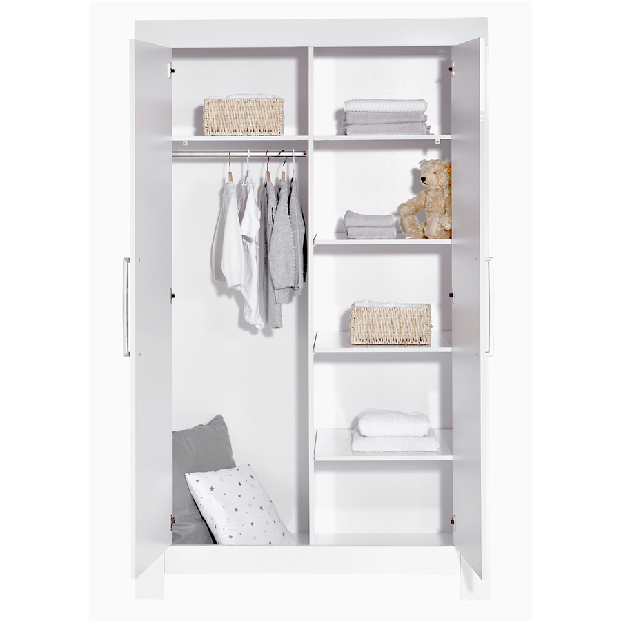 Nordic splende in bianco! Stile moderno con laccatura lucida. In bianco lucente. Dettagli del prodotto: Colore: bianco Materiale: legno truciolato Dimensioni: Lunghezza x Ampiezza x Altezza 109 x 53 x 189 cm 2 ante con sistema di chiusura soft close 1 asta appendiabiti orizzontale 5 mensole Attenzione: Le decorazioni NON sono incluse nella spedizione!