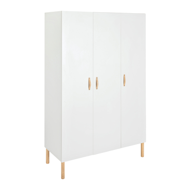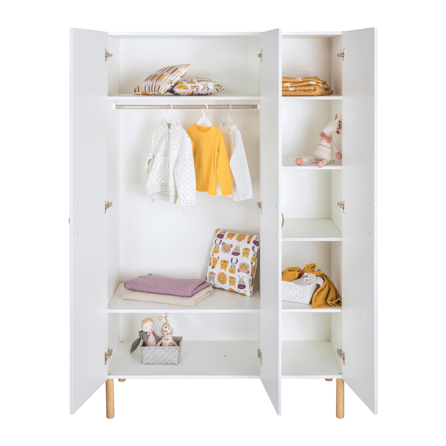Dettagli del prodotto: Colore: bianco Materiale del mobile e dei frontali: truciolato, rivestito in melamina Materiale telaio di base: faggio massiccio, oliato Dimensioni: larghezza x profondità x altezza 120 x 53 x 190 cm Maniglie in pelle 3 porte con sistema soft-close 2 scaffali lunghi 4 piccoli scaffali 1 asta appendiabiti Prodotto in Germania Schardt come vincitore del test impegno sostenibile Premio Schardt massima raccomandazione da parte dei clienti