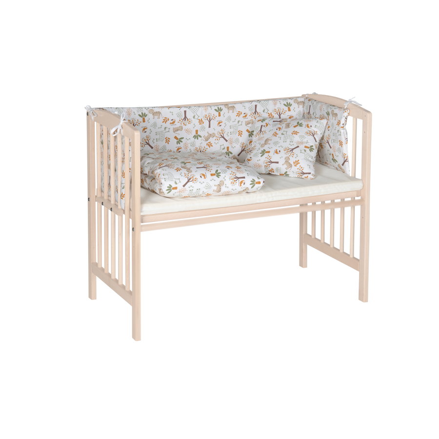 Dettagli del prodotto: Letto laterale in legno massiccio di faggio Utilizzabile come culla e letto aggiuntivo per letti a molle insacchettate Incluso lato di trasformazione e sistema di cinghie per il fissaggio al letto a molle Lato lettino con 3 doghe Rete a doghe regolabile in altezza in continuo da 30 cm a 55 cm Materiale e cura: Materiale: Faggio massiccio, laccato beige carato Dimensioni e peso: Lunghezza: 94 cm Larghezza: 52 cm Altezza: 88,5 cm Superficie di appoggio: 90 x 45 cm Carico massimo: 15 kg Incluso nella fornitura: Lettino per bambini Nota bene: il materasso e la decorazione non sono inclusi nella fornitura.