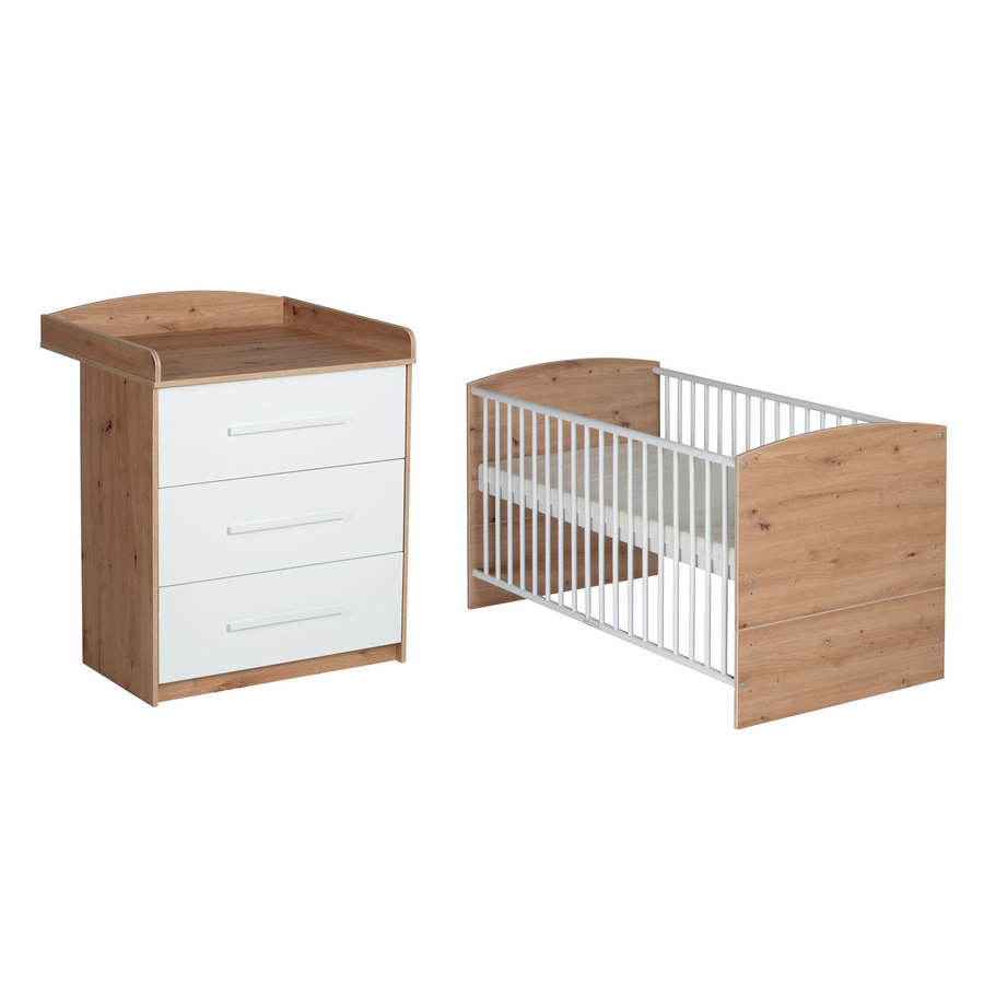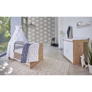 Dettagli del prodotto: Prodotto in Germania Schardt vincitore del test impegno sostenibile Letto combinato per bambini 70 x 140 cm Dettagli del prodotto: Rete a doghe tonde Con 3 pioli scorrevoli Rete a doghe regolabile in 3 posizioni 2 sponde per la trasformazione in letto Junior Dimensioni e peso: Dimensioni: lunghezza: 143 cm, larghezza: 77 cm, altezza: 79,5 cm Dimensioni del materasso: lunghezza: 140 cm, larghezza: 70 cm Dimensioni dei lati di conversione: Lunghezza: 140 cm Carico massimo: 15 kg Materiale e cura: Testiera e pediera: melamina Artisan Oak decor Sponda tonda: Legno di faggio massiccio, laccato bianco Telaio a doghe: legno massiccio di faggio Fasciatoio con piano fasciatoio Dettagli del prodotto: 3 cassetti con meccanismo di autochiusura e guide laterali extra robuste Piano di cambio incluso Dimensioni e peso: Dimensioni: altezza: 98 cm, larghezza: 79 cm, profondità: 43/68 cm Altezza cambio: 86 cm Materiale e cura: Corpo: Rovere Artigianale Frontali: Decoro bianco Incluso nella consegna: Lettino combinato Fasciatoio con piano fasciatoio Attenzione: il materasso e la decorazione non sono inclusi nella fornitura.