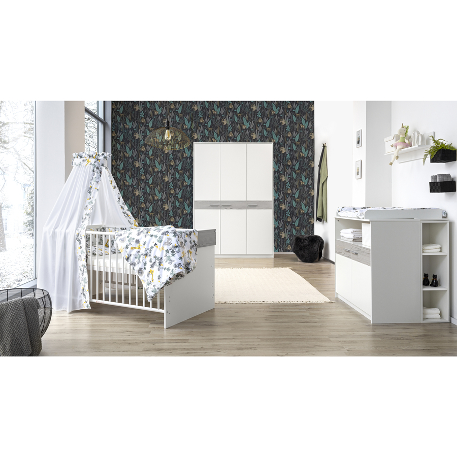 Dettagli del prodotto: Prodotto in Germania Schardt vincitore del test impegno sostenibile Letto combinato per bambini 70 x 140 cm Dettagli del prodotto: Rete a doghe tonde Con 3 pioli scorrevoli Rete a doghe regolabile in 3 posizioni Trasformabile in letto Junior utilizzando le sponde di conversione disponibili separatamente Dimensioni e peso: Dimensioni: lunghezza: 144 cm, larghezza: 77 cm, altezza: 80 cm Dimensioni del materasso: lunghezza: 140 cm, larghezza: 70 cm Dimensioni dei lati di conversione: Lunghezza: 140 cm Carico massimo: 15 kg Materiale e cura: Base: decorazione bianca con inserto in pino Boathouse. Sponda rotonda: legno di faggio massiccio, verniciato bianco Telaio a doghe: legno di faggio massiccio Fasciatoio con piano fasciatoio Dettagli del prodotto: 1 scomparto aperto 1 ripiano Fasciatoio incluso Dimensioni e peso: Dimensioni: altezza: 94 cm, larghezza: 100 cm, profondità: 42,5/67,5 cm Altezza fasciatoio: 86 cm Materiale e cura: Corpo: decoro bianco Ante: decoro bianco con inserto in pino Boathouse Incluso nella consegna: Lettino combinato Fasciatoio con piano fasciatoio Attenzione: il materasso e la decorazione non sono inclusi nella fornitura.