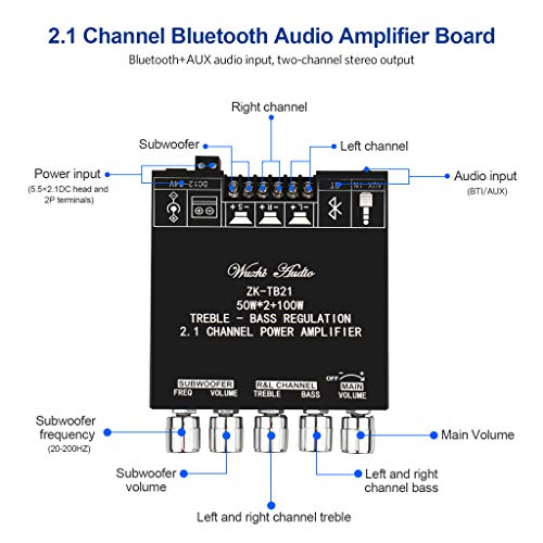 ▶[Scheda amplificatore audio subwoofer] 50 W + 50 W + 100 W connessione radio Bluetooth 5.0 + ingresso audio AUX, uscita stereo 2.1 canali, solo un po' di distorsione del suono. Nota: quando si utilizza la modalità AUX, si prega di confermare che la connessione Bluetooth di questo modulo è stata separata.