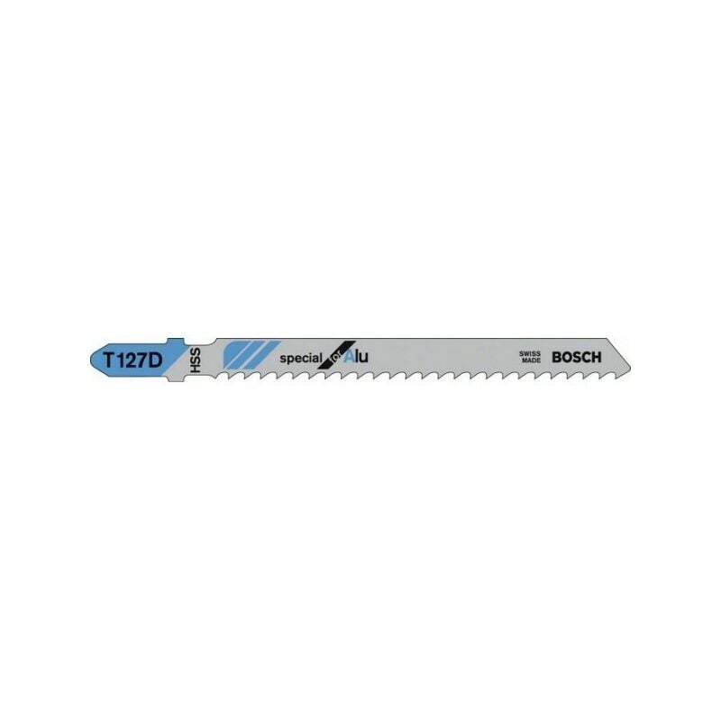 Dettagli: Lama per seghetto alternativo T 127 D HSS, dentatura progressiva, set, fresato. Configurazione del dente: incastonato, fresato. Lunghezza totale: 100 mm Passo: 3 mm. Numero di pezzi: 5. Lamiera 3-15 mm. Alluminio
