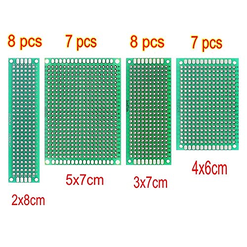Scheda universale PCB a doppia faccia da 30 pezzi: scheda PCB universale da 8 pezzi 2 x 8 cm, scheda PCB universale da 8 pezzi 3 x 7 cm, scheda PCB universale da 7 pezzi 4 x 6 cm, scheda PCB universale da 7 pezzi 5 x 7 cm.