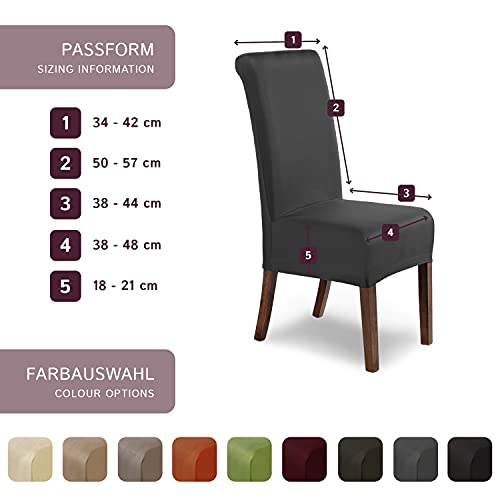 SI ADATTANO A PERFEZIONE ALLE TUE SEDIE - Grazie alla particolare composizione del tessuto (96% poliestere, 4% elastan, 290 g/m²) delle nostre fodere per sedie e alla loro fascia elastica, la nostra copertura protettiva per sedie si inserisce velocemente e resta sempre al suo posto. Non è adatta a schienali arrotondati.