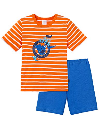 Pigiama corto per ragazzi della serie Schiesser subacqueo maglietta blu con motivo marino pesce, balena e squalo in arancione, bianco e diversi Piccola etichetta Schiresser sulla cucitura laterale blu scuro, pantaloncini corti in morbido jersey di qualità