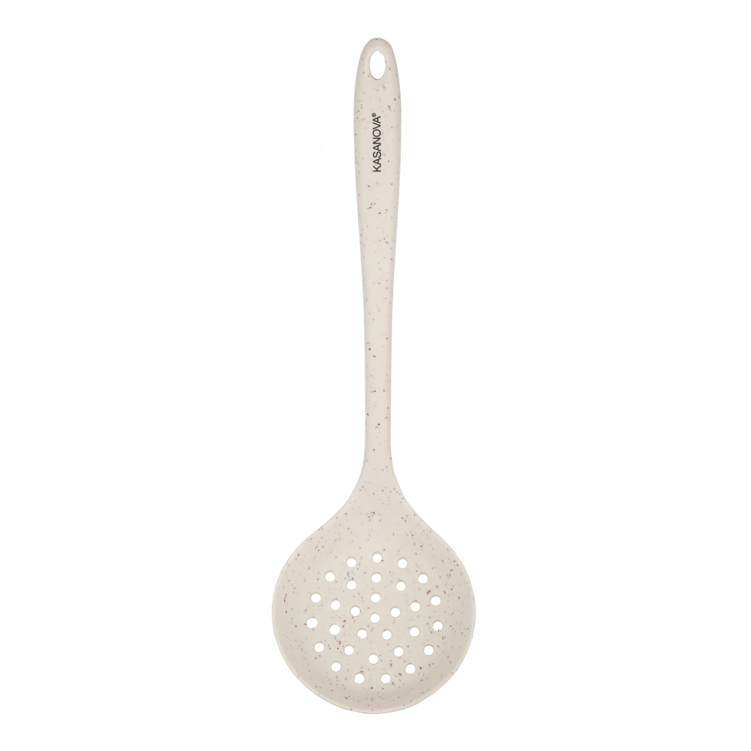 La linea di utensili da cucina Eco White con il suo caratteristico rivestimento bianco in silicone è perfetta per cucinare preservando le tue pentole a lungo. La schiumarola in silicone può essere infatti usata senza problemi a contatto con il rivestimento di padelle, casseruole e tegami senza il rischio di graffiarli e rovinarli. È ideale per sollevare gli alimenti durante la cottura in acqua o in olio bollente senza il rischio di scottarsi. Grazie al foro posto sul manico può essere appesa in bella vista accanto agli altri accessori della linea e sempre pronta all'uso. Puoi lavarla sia a mano che in lavastoviglie.