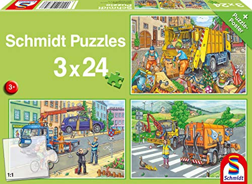 Schmidt Spiele- Carrello della Spazzatura, Auto da Traino e spazzatrice, Puzzle per Bambini, 3 x 24 Pezzi, Multicolore, 56357
