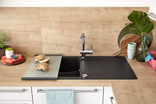 Design: il lavello dal design purista e moderno in granito con effetto pietra naturale ha una vasca dal volume extra per grandi pentole e un scolapiatti, che può essere utilizzata anche come ripiano aggiuntivo.