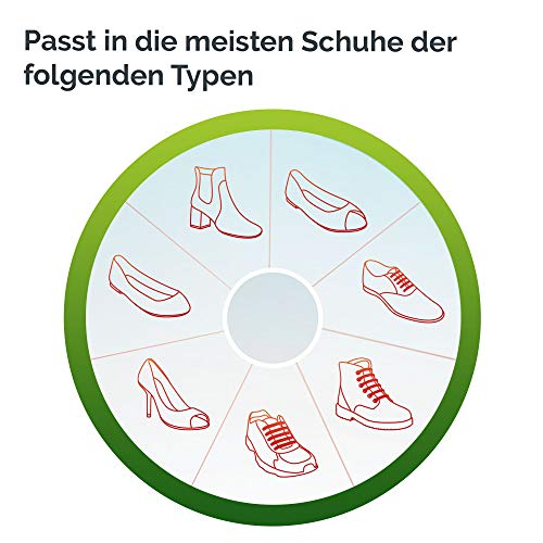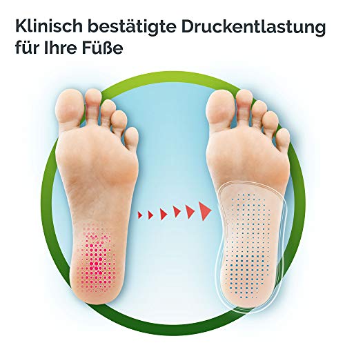 Vestibilità adatta al piede per una distribuzione uniforme del peso e riduzione della pressione. Imbottitura metatarsale per ammortizzare la zona dell'alluce valgo. Sostegno delicato dell'arco plantare per alleviare il carico.