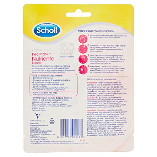 Scholl Pedimask Maschera Piedi Nutriente con Olio di Macadamia, 0% Profumi e Coloranti, 1 Paio di Calzini Idratanti, Tempo di azione: 20 minuti