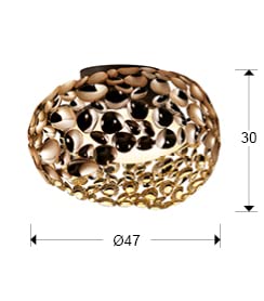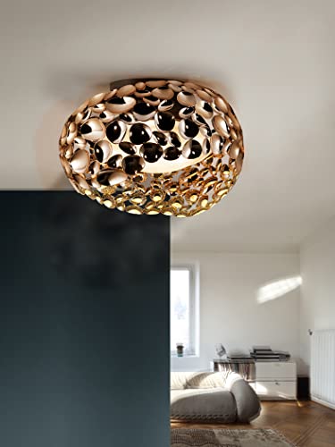 Lampada tipo soffitto di 5 luci, modello narisa di SCHULLER, realizzata in metallo con finitura oro rosa, misura 46 cm. di diametro e 28 cm. di altezza, ha un diffusore interno acrilico. Illuminazione per cinque lampadine di tipo G9.