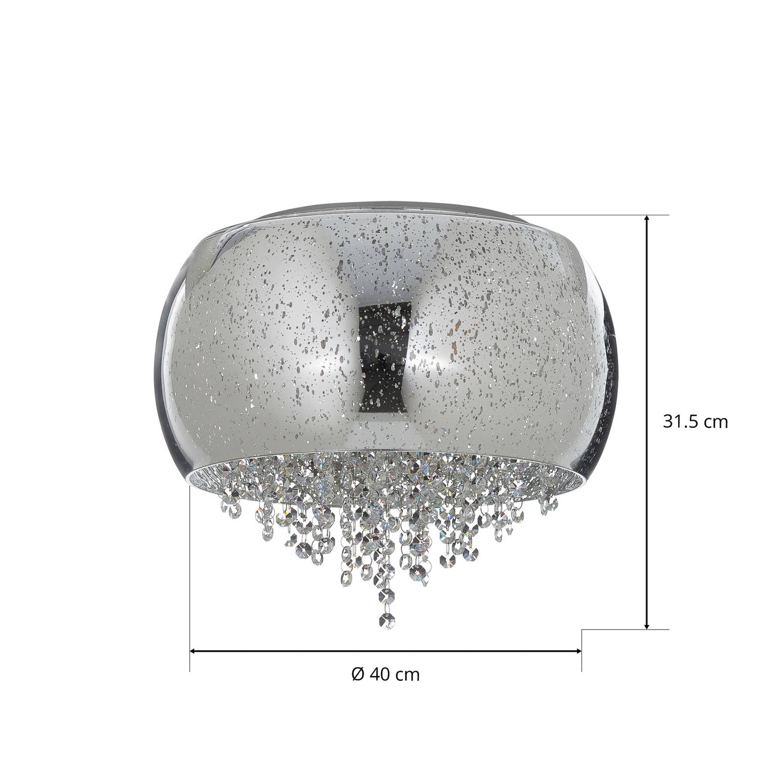 Caelum - plafoniera LED con effetto stellato La plafoniera Caelum LED si presenta abbagliante e scintillante sul soffitto, in quanto il paralume in vetro specchiato d'argento è dotato di un ornamento che ricorda un cielo stellato. Un ulteriore scintillio si ottiene attraverso le catene di cristallo sfaccettate ornamentali, applicate a lunghezze differenti all'interno del paralume. Questo design elegante e splendente fa della plafoniera LED un oggetto scintillante sul soffitto, una vera highlight quando la luce è accesa.